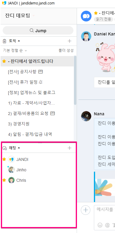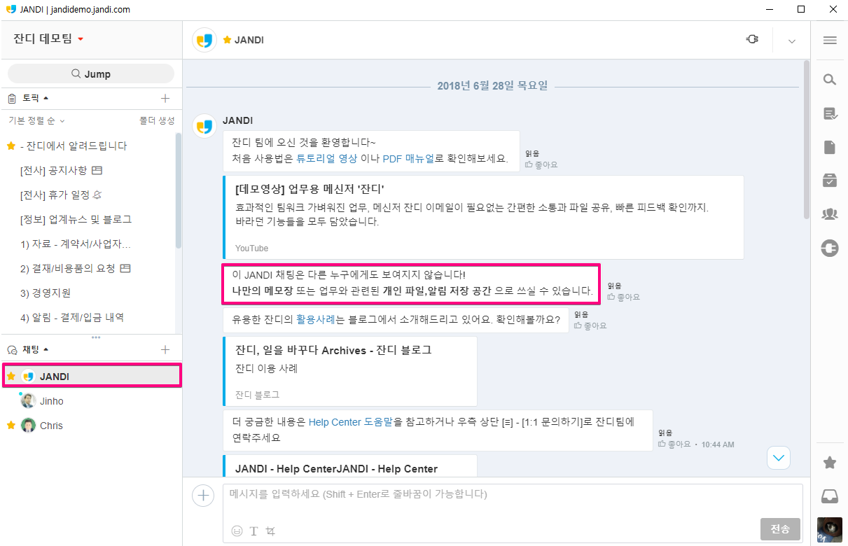 3. 멤버 중 JANDI는 실제 멤버가 아닌 시스템 상의 대화방으로 나만의 메모장처럼 사용할 수 있습니다.